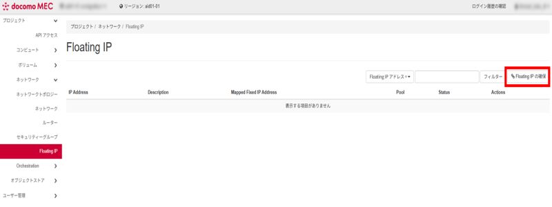 ポータルへログインし、「ネットワーク」から「Floating IP」を選択し、「Floating IPの確保」をクリックします。
