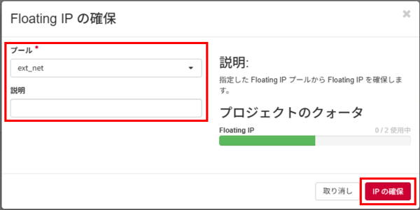 項目名 説明 プール 「ext_net」を選択してください。説明 説明文を入力します。 -