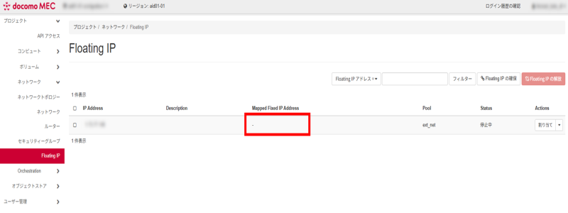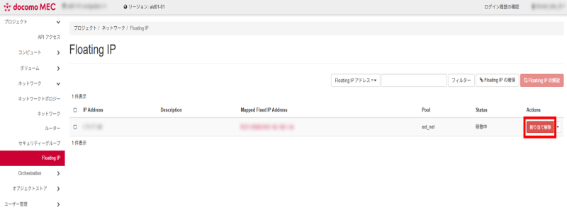 Floating IPの割り当て解除 Floating IPの割り当て解除についてご利用手順をご説明いたします。 操作手順 割り当てを解除したいFloating IPの「割り当て解除」をクリックします。 内容を確認の上、「割り当て解除」をクリックします。 割り当てが解除されていることを確認します。
