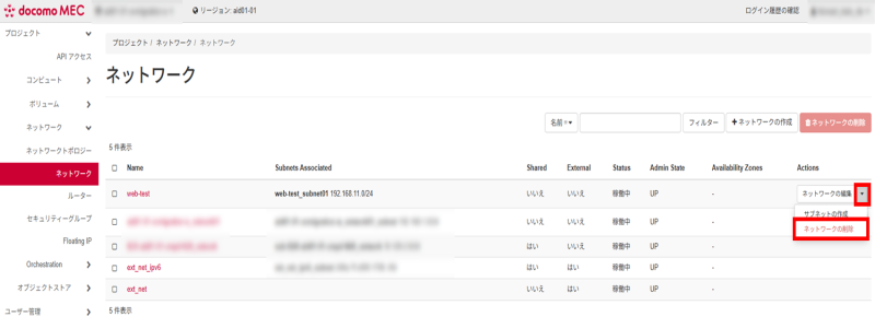 削除したいネットワークの「Actions」から「▼」をクリックし、「ネットワークの削除」をクリックします。