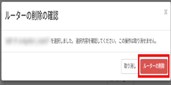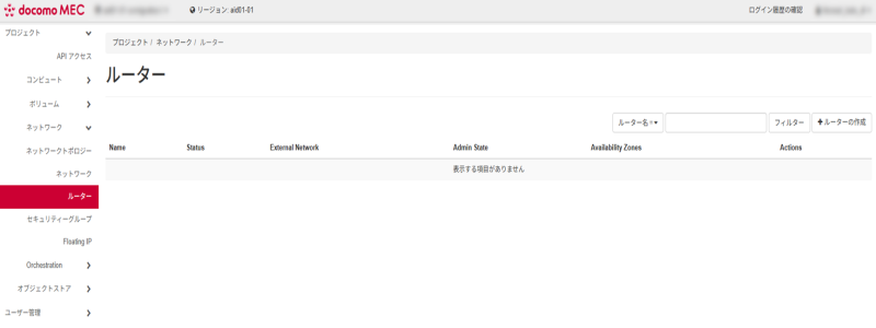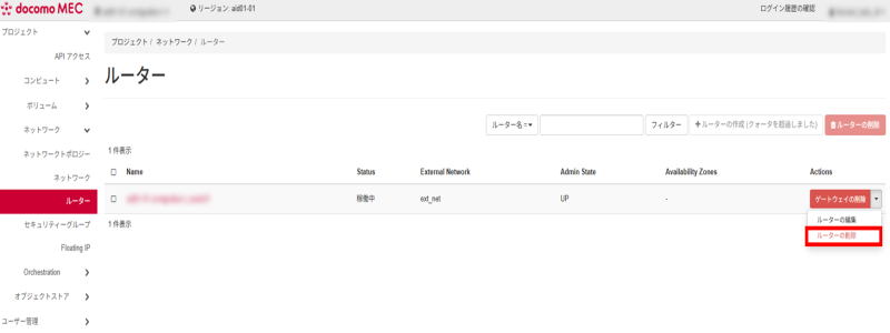 ルーターの削除 ルーターの削除についてご利用手順をご説明いたします。 前提条件 事前にFloating IPが解放済みであること。 注意事項 再度ルーターを新規作成した場合、外部ゲートウェイのIPアドレスは都度変更となります。 操作手順 削除したいルーターの「Actions」から「▼」をクリックし、「ルーターの削除」をクリックします。 内容を確認の上、「ルーターの削除」をクリックします。 該当のルーターが削除されていることを確認します。