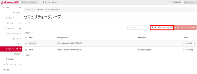 ポータルへログインし、「ネットワーク」から「セキュリティーグループ」を選択し、「セキュリティーグループの作成」をクリックします。