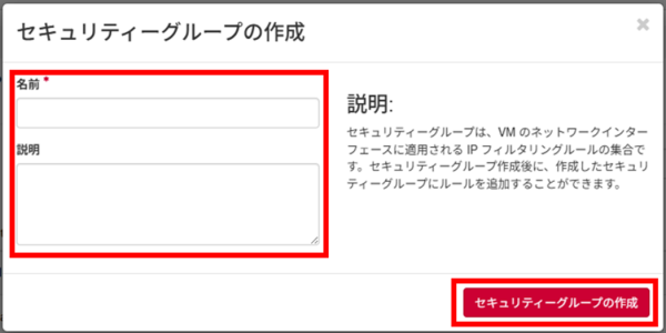 項目名説明名前 セキュリティーグループ名を入力します。説明 説明文を入力します。 -