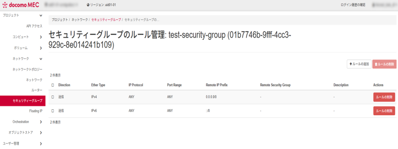 作成後、作成した「セキュリティーグループのルール管理」に画面遷移します。
