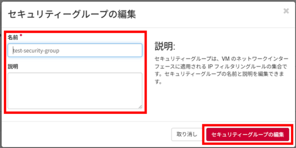 必要事項を変更し、「セキュリティーグループの編集」をクリックします。