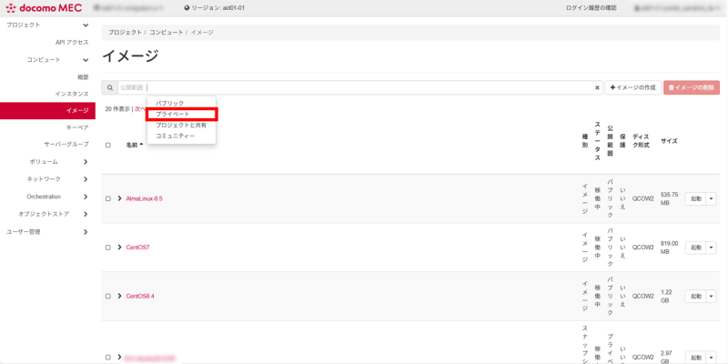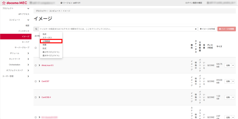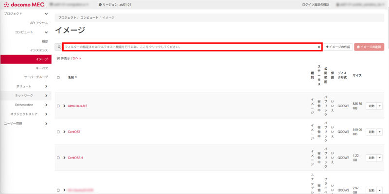 ポータルへログインし、「コンピュート」から「イメージ」を選択し、フィルターメニューをクリックします。