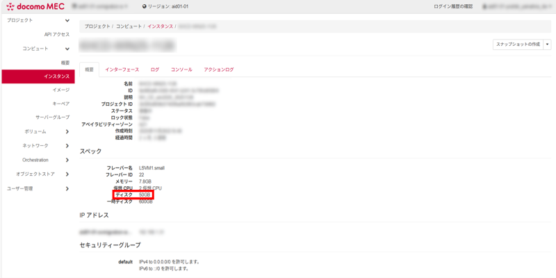 スナップショットを作成したいインスタンスのディスクサイズと比較し、残り空き容量が多いことを確認してください。※不足している場合、リソースの追加申し込みを行ってください。