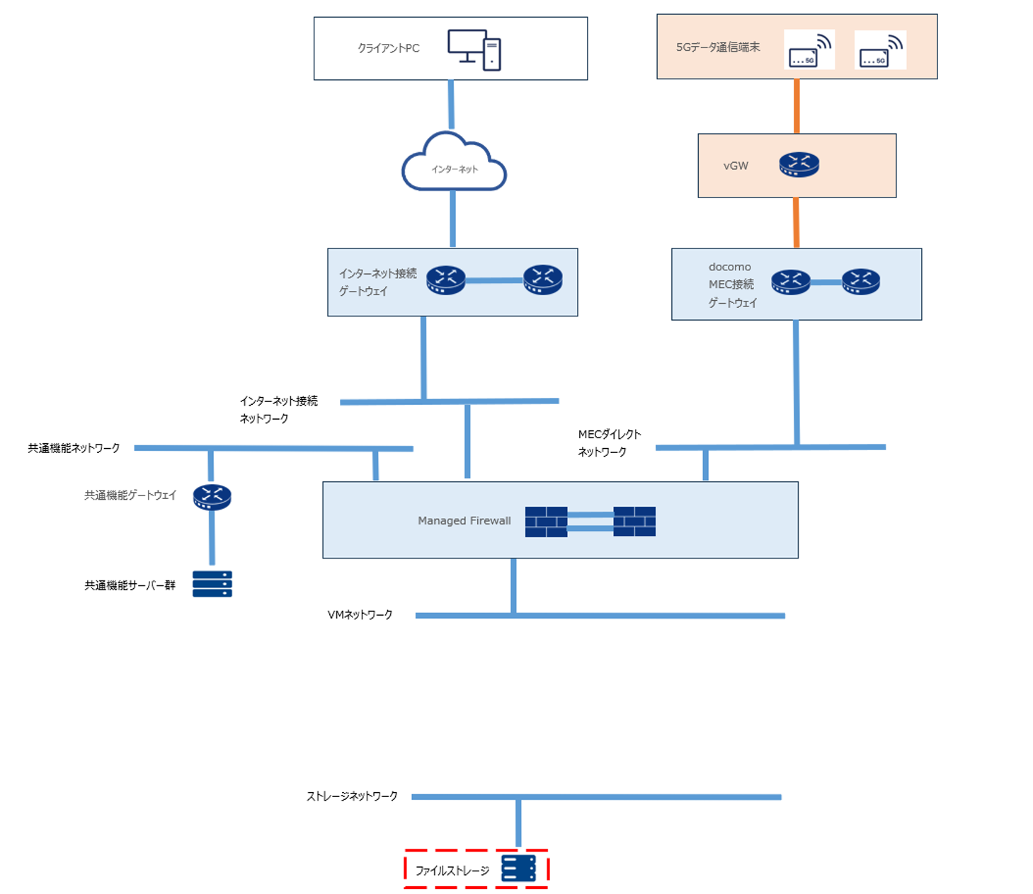 概要 下記イメージ図の赤破線枠箇所のファイルストレージを作成します。 ファイルストレージの作成 ファイルストレージを作成します。 詳細については以下をご参照ください。 ファイルストレージの新規作成方法 ※WindowsクライアントからのNFSマウント、およびLinuxクライアントからのSMBマウントはサポートしていません。 作成したファイルストレージの設定をします。 詳細については以下をご参照ください。 ファイルストレージの操作方法