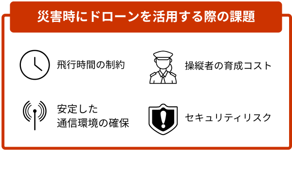 ドローンは災害対応において大きな効果が期待できる一方で、実際に運用するにあたっては解決すべき課題もあります。ここでは主な課題を4つご紹介します。